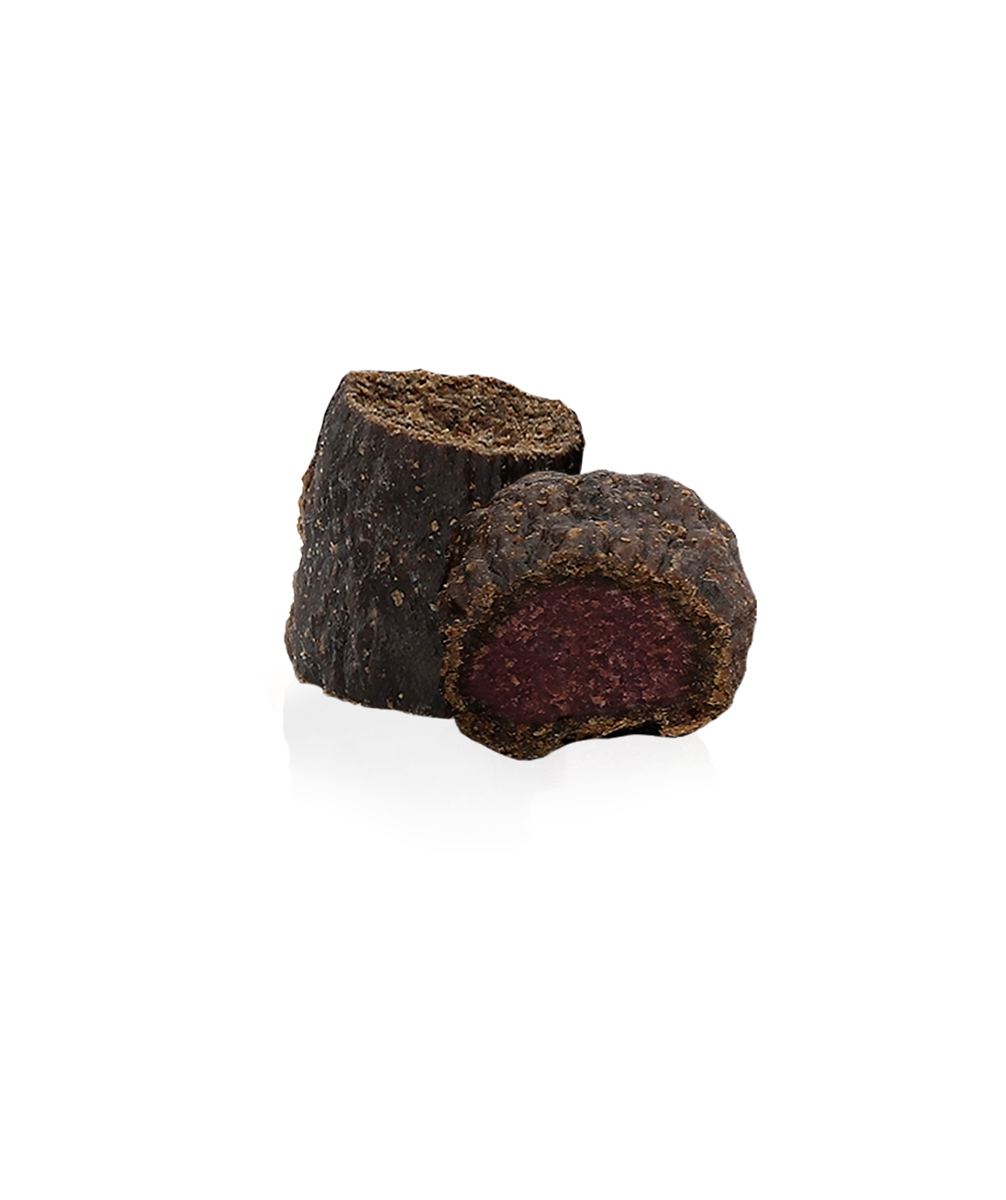 En la práctica, este método mantiene estable el nivel de azúcar en sangre del perro; el alto contenido de carne fresca estimula sus instintos; la baja temperatura de cocción preserva el valor nutricional; las bayas, semillas y hierbas evocan el contenido estomacal de sus presas naturales; y el tamaño de las croquetas garantiza que el perro mastique bien la comida y no la trague entera.