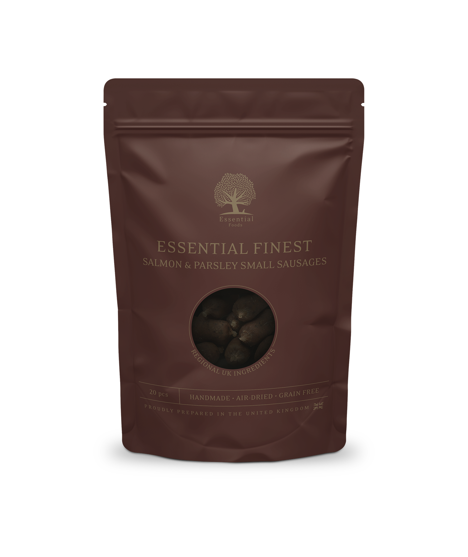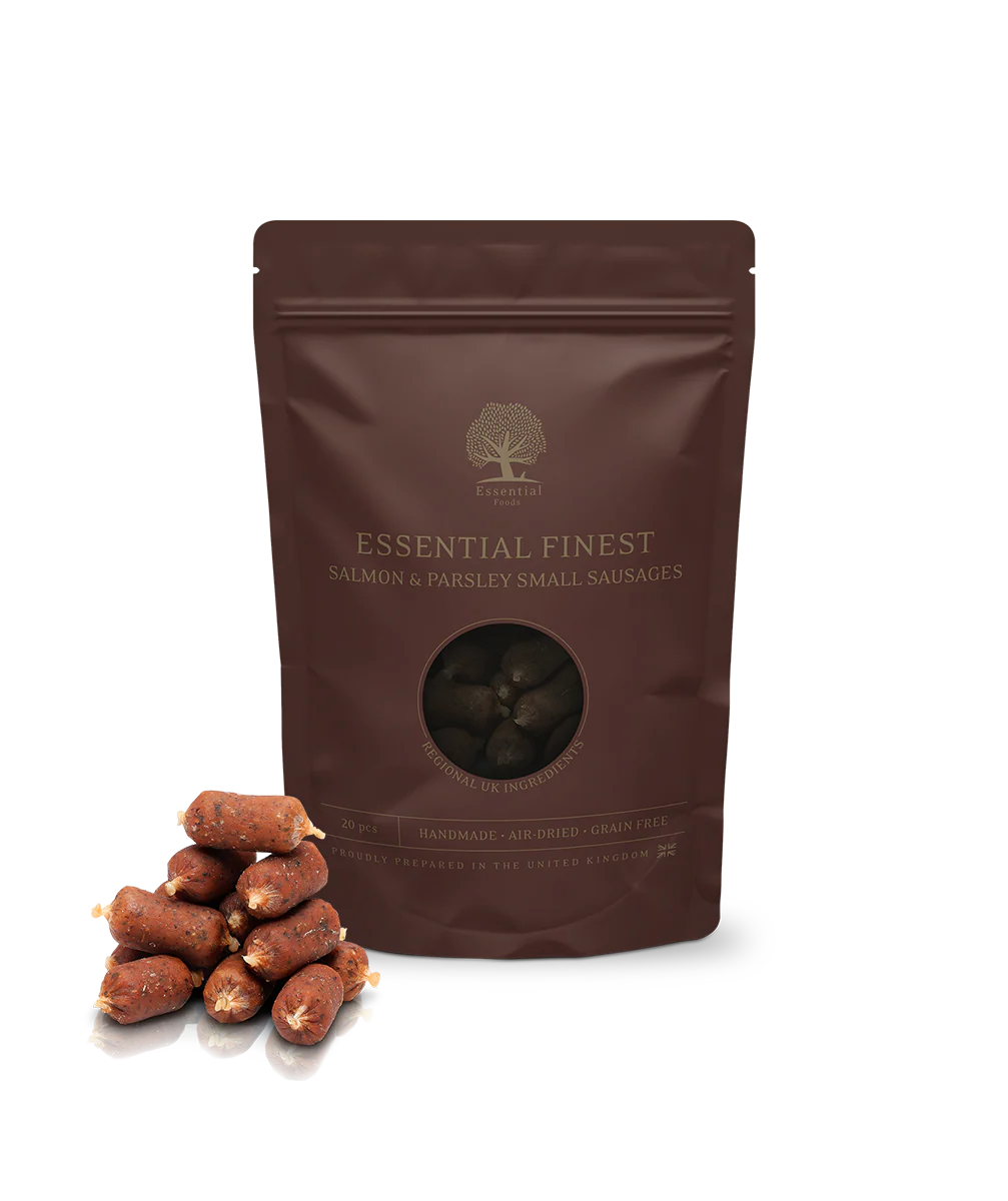 Essential Finest Salmon y Perejil es un manjar artesanal de Yorkshire, bajo en grasa (2,2 %) y elaborado solo con salmón, patatas, glicerina, aceite de salmón y perejil. Ideal como snack saludable y gourmet.