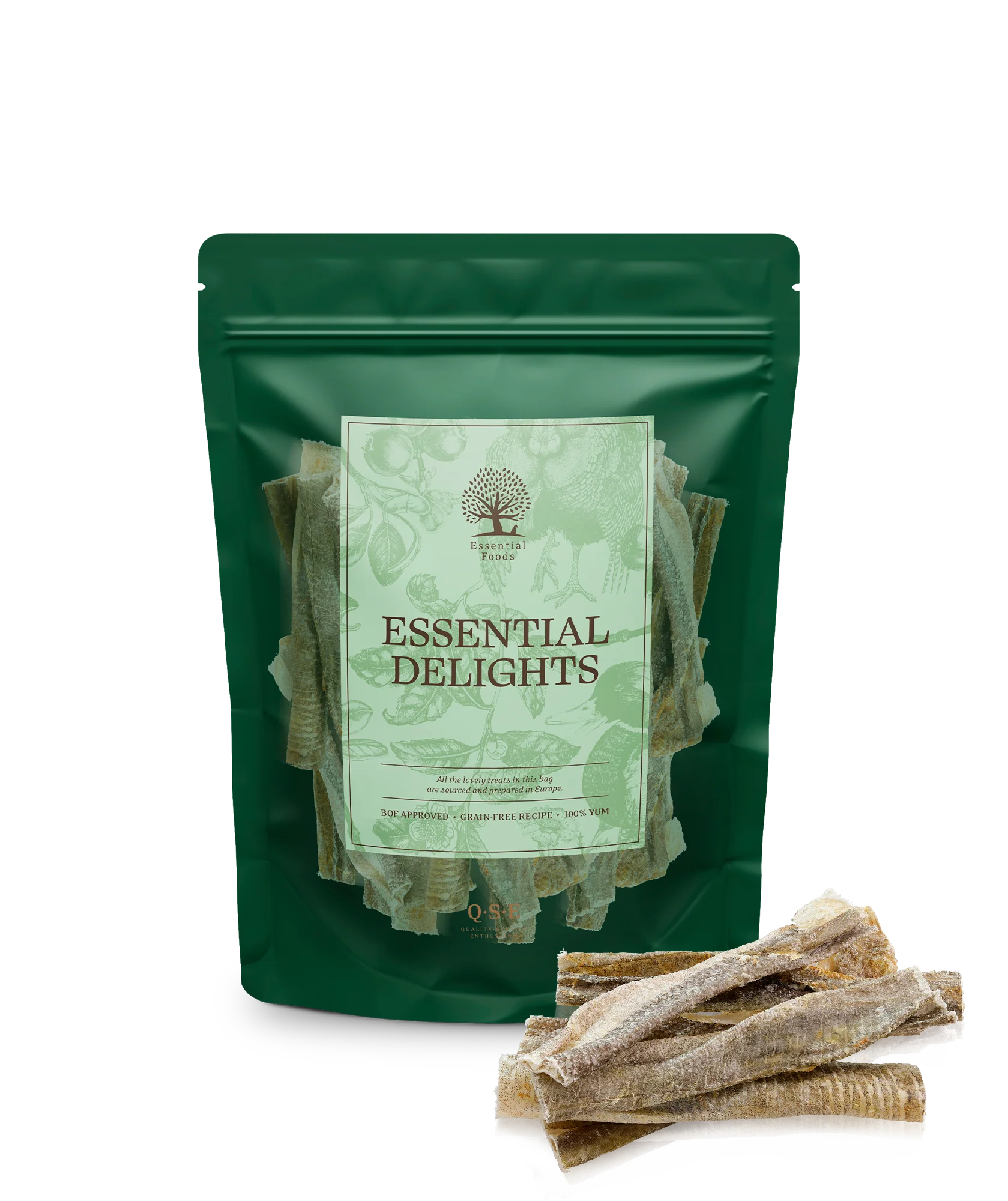 Salmón y trucha escoceses frescos (42%), boniato, pescado de temporada deshidratado (18%), guisantes, salmón deshidratado (6%), huevo entero (3%), pescado fresco de temporada (3%), aceite ESSENTIAL de OMEGA 3 (3%), semillas de lino, alfalfa, salsa de salmón (2%), patata, fibra de guisante, vitaminas, minerales, manano-oligosacáridos, fructo-oligosacáridos, glucosamina, MSM (metilsulfonilmetano), condroitina, arándano rojo, açai, arándano azul, mora, manzana, tomate, naranja, pera, zanahoria, espinaca, coliflor, algas marinas, caléndula, ginseng, té verde descafeinado y jengibre.