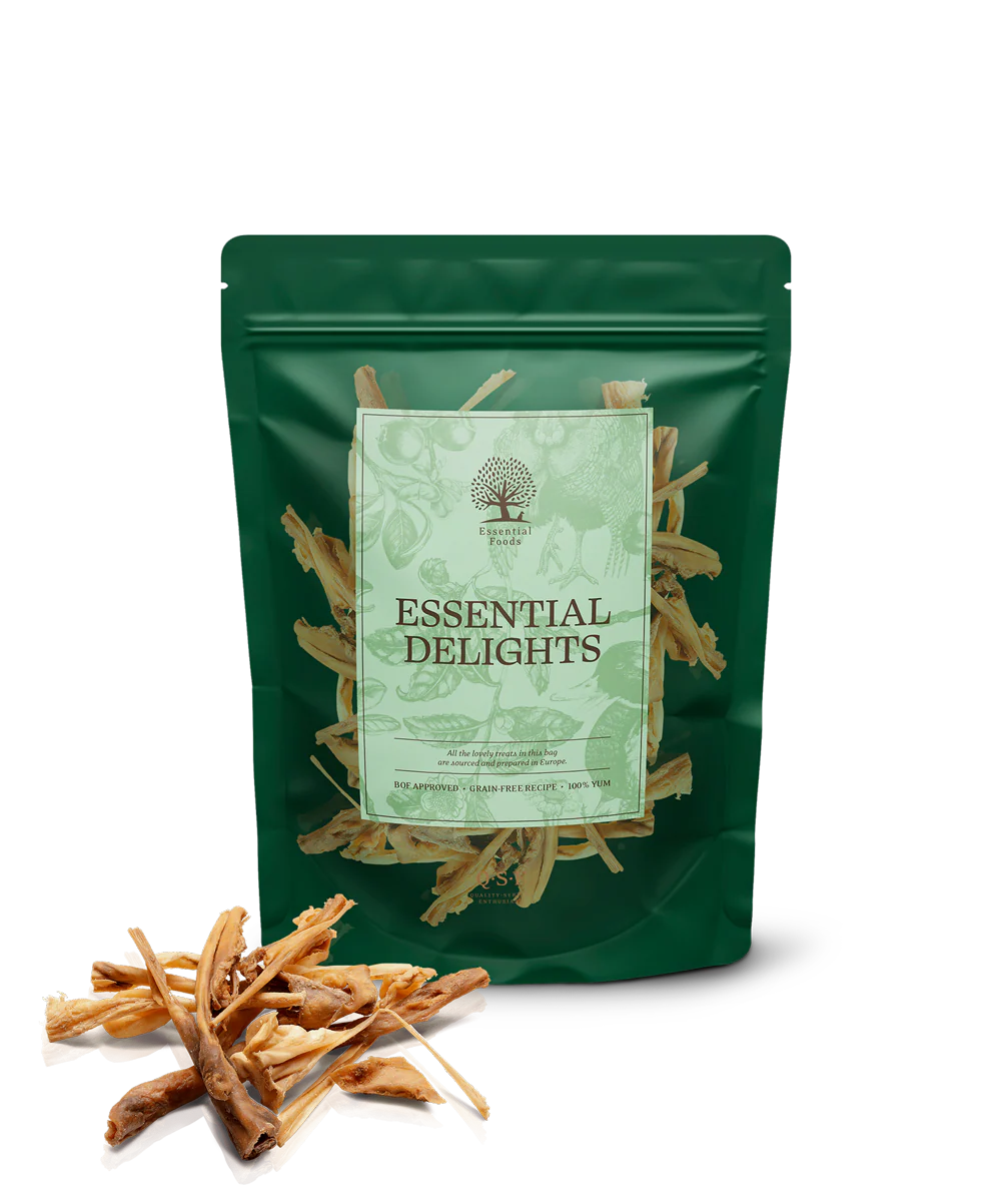 Essential Small Lamb Skin Delights: versión más pequeña, perfecta para perros de hasta 10 kg, aunque irresistible para todos. Snack delicioso y fácil de masticar.