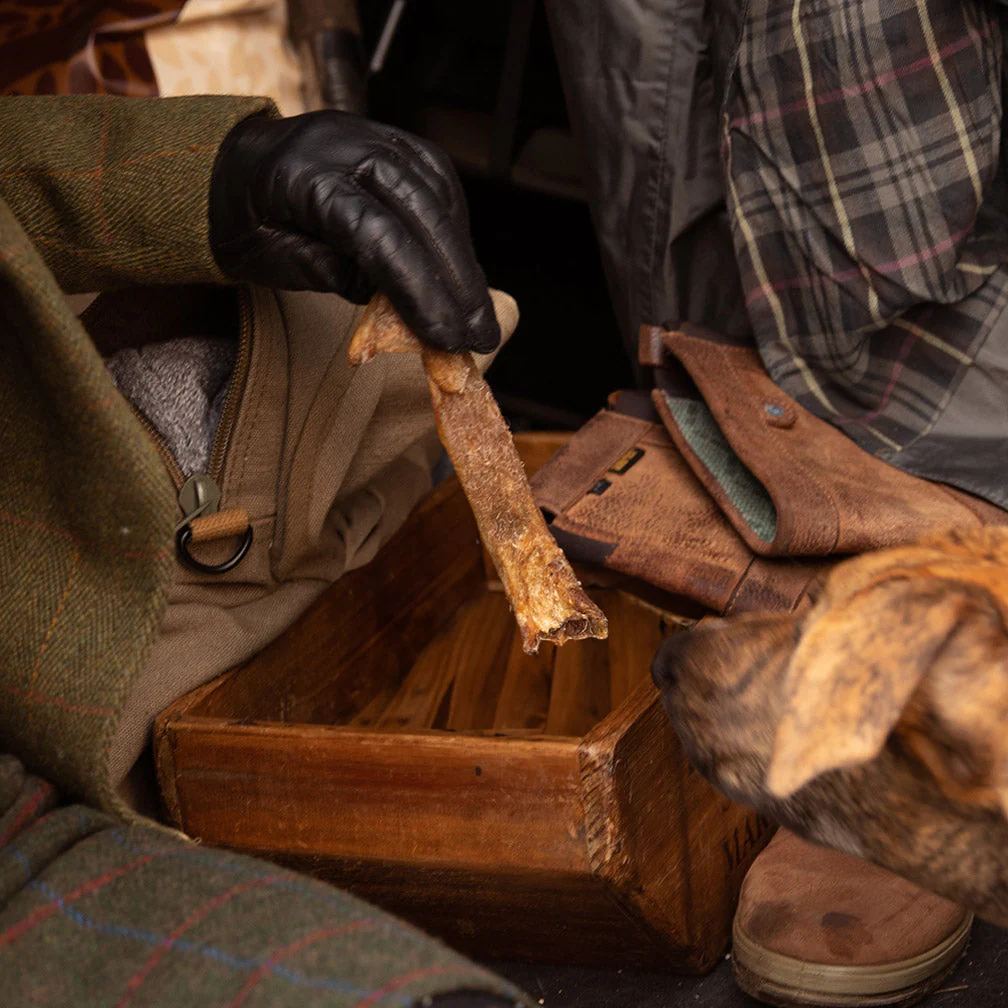 Essential Wild Boar Delights ofrece un snack natural para perros con carne de jabalí 100 % pura, secado al aire para conserva el sabor y crea una masticación firme. El producto no incluye cereales ni aditivos artificiales. Su textura ayuda a limpiar los dientes y reduce la acumulación de placa.