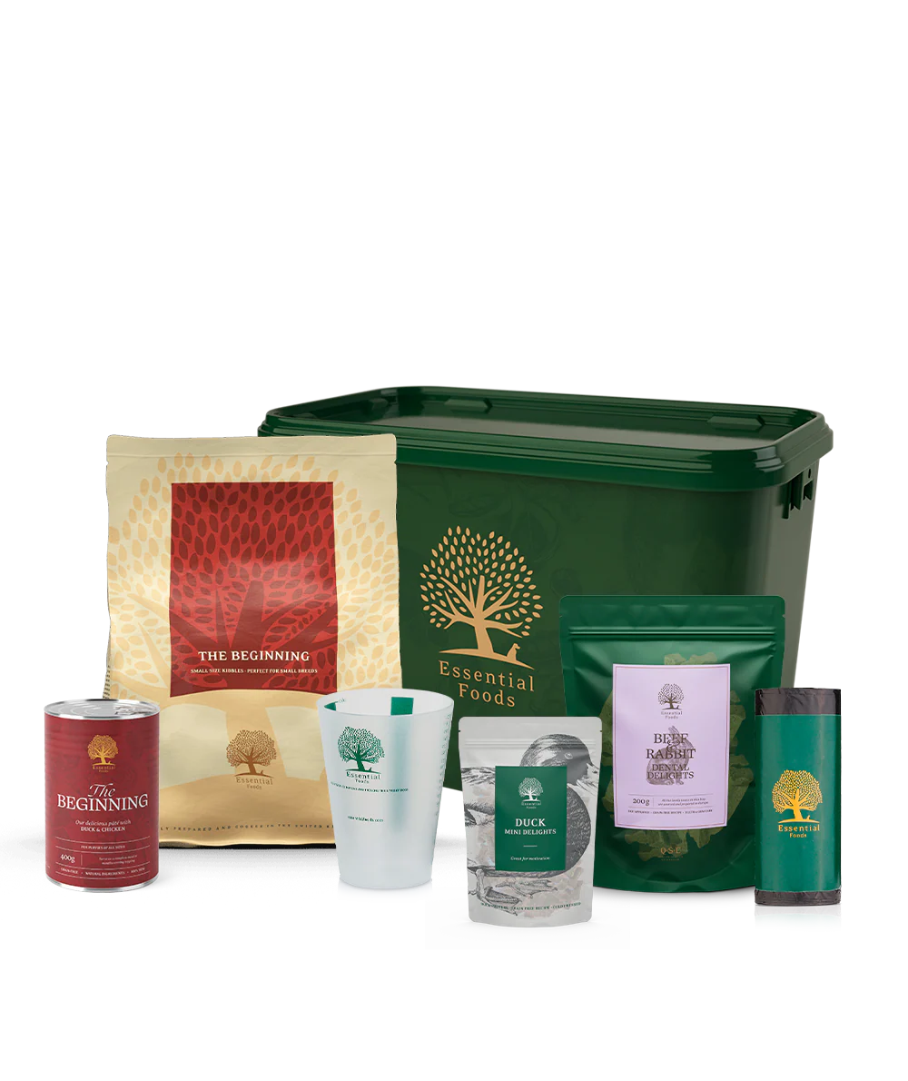 Además, el pack incluye nuestro sabroso THE BEGINNING PÂTÉ, 2 bolsas de deliciosos premios para cachorros, un vaso medidor, un rollo de bolsas higiénicas, y un práctico recipiente de almacenamiento.