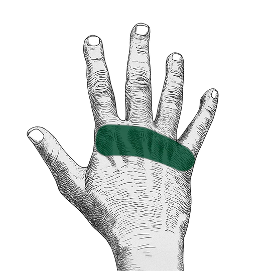 Abre la mano, con la palma hacia abajo, y deslice suavemente los dedos sobre los nudillos. Si la caja torácica de tu perro se siente así (fácil de sentir con una capa fina y suave de acolchado), su condición corporal está en el rango ideal.